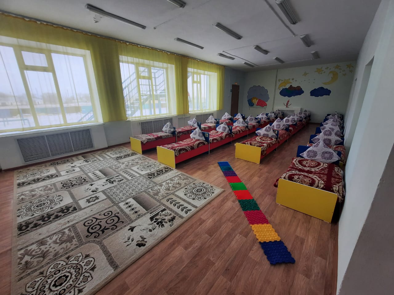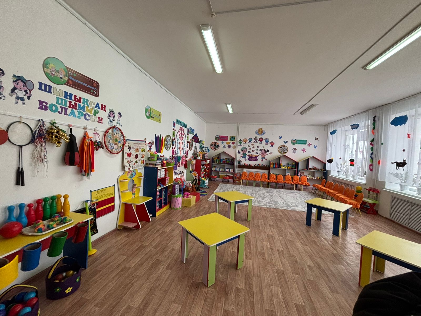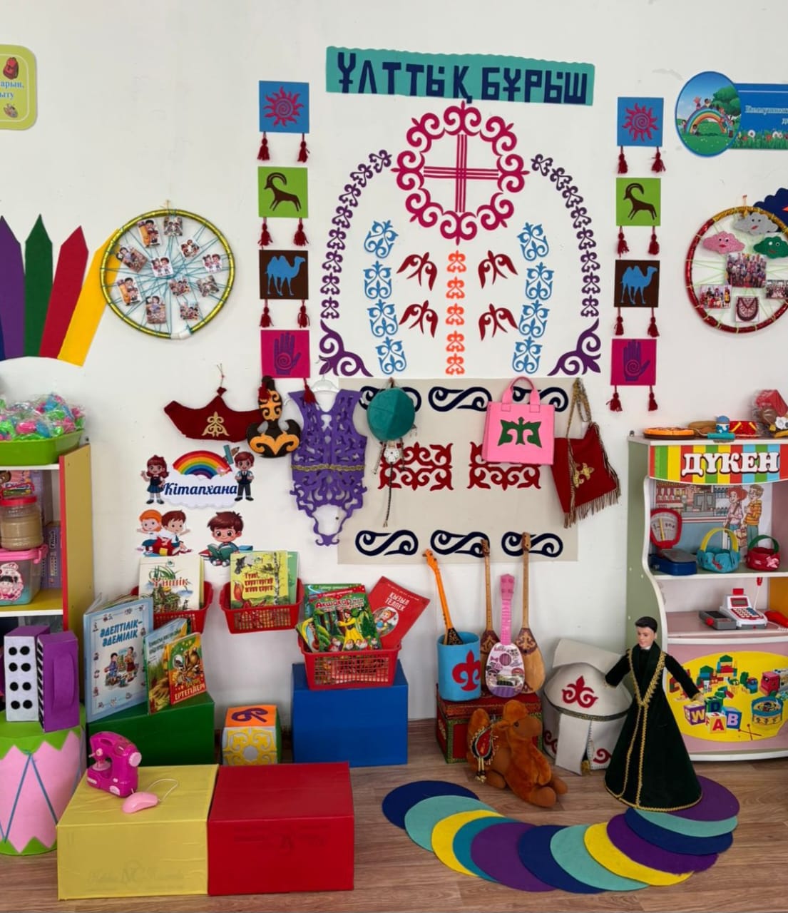 Мақсаты: Балаларды негізгі түстермен (қызыл, сары, жасыл, көк) таныстыру, түстерді ажыратып, дұрыс атай білуге үйрету. Ойын арқылы зейінін, есте сақтау қабілетін және сөйлеу дағдыларын дамыту.